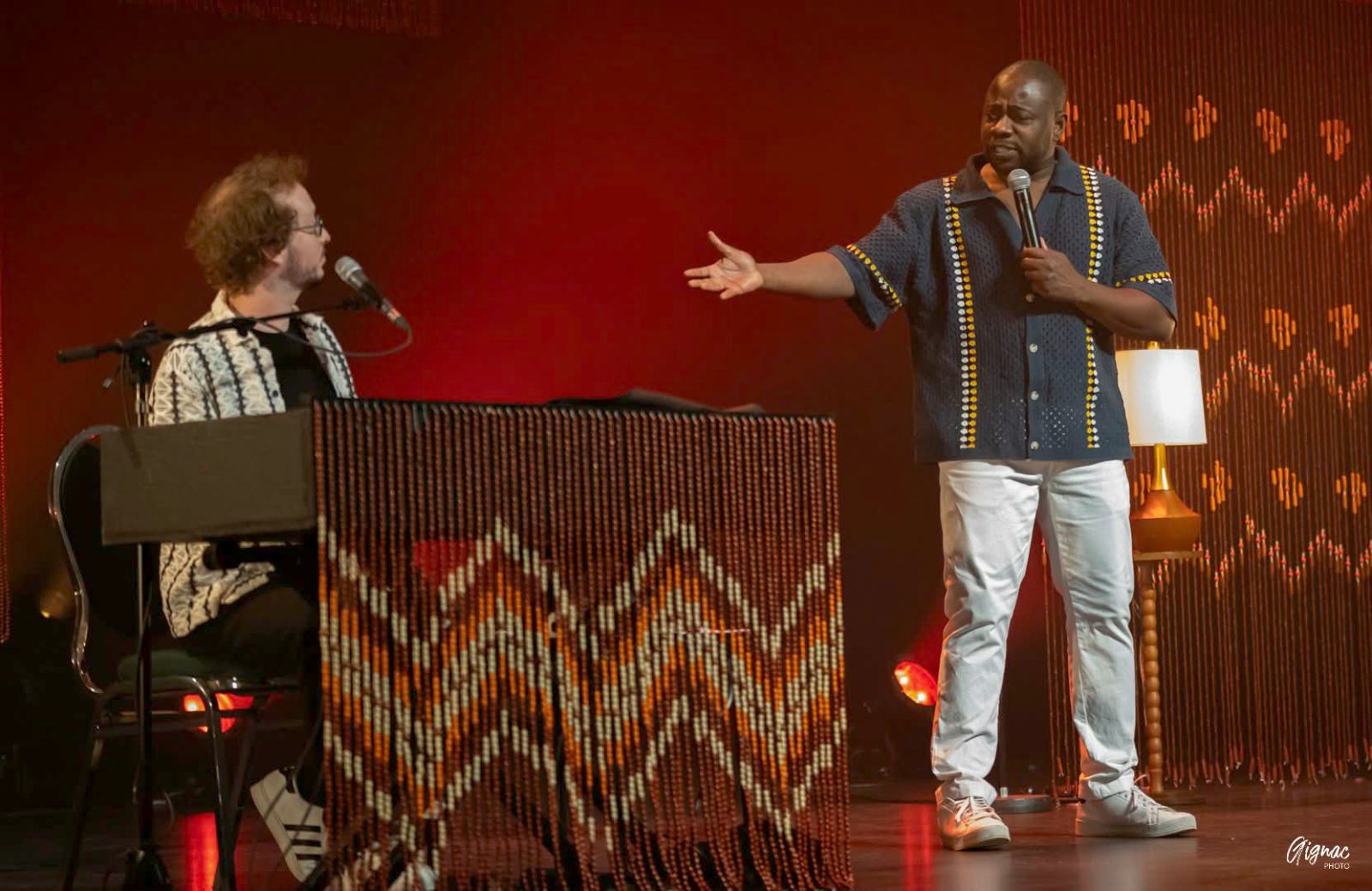 L’humoriste d’origine haïtienne transforme la scène en fête culturelle. Il a le sens du punch dans tous les sens du terme. Un punch bien dosé, juste assez relevé. Un punch coloré et savoureux aux douces essences multiculturelles.