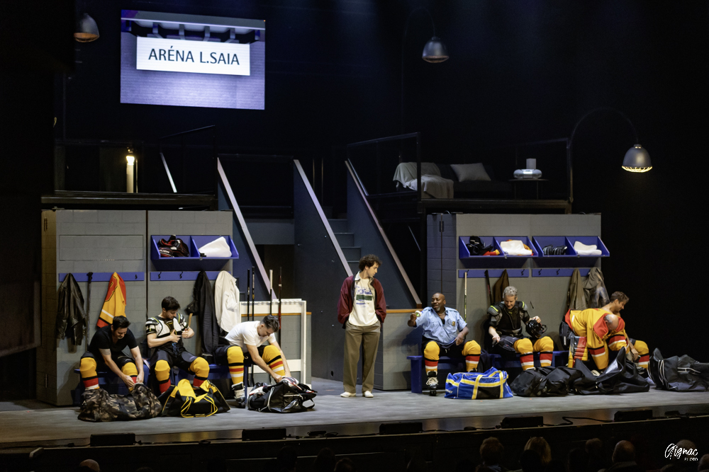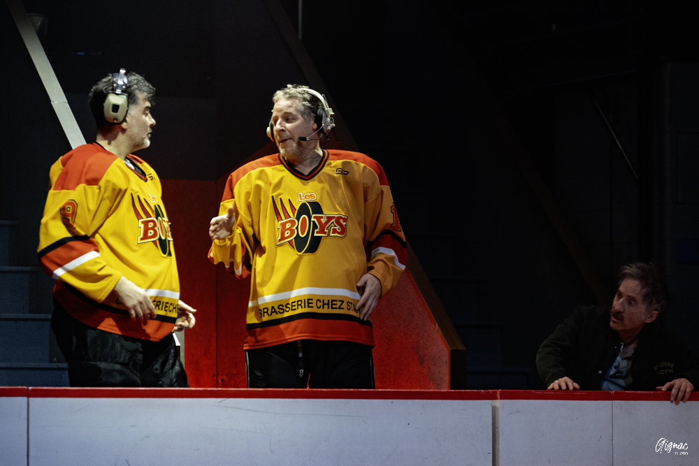 La première période a débuté plutôt timidement comme pour un club de hockey qui n’a pas joué depuis quelques jours. On redécouvre chacun des personnages sur un coin de la scène divisée en quatre plateaux disposés sur deux étages. Ces plateaux deviendront successivement le bureau de Stan, le garage de Mario, le salon de Fern, la brasserie Chez Stan avant de devenir les arénas L.Saia et R.Goudreau, nommées en l’honneur des deux concepteurs de l’histoire originale. Le décor est vraiment magnifique et nous transporte habilement d’une scène à l’autre.