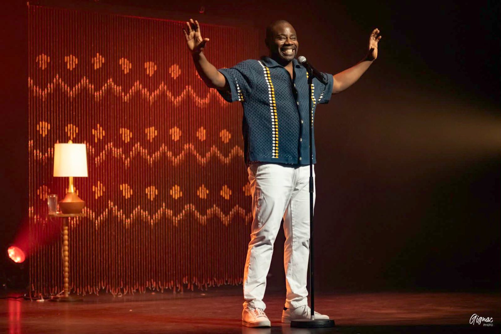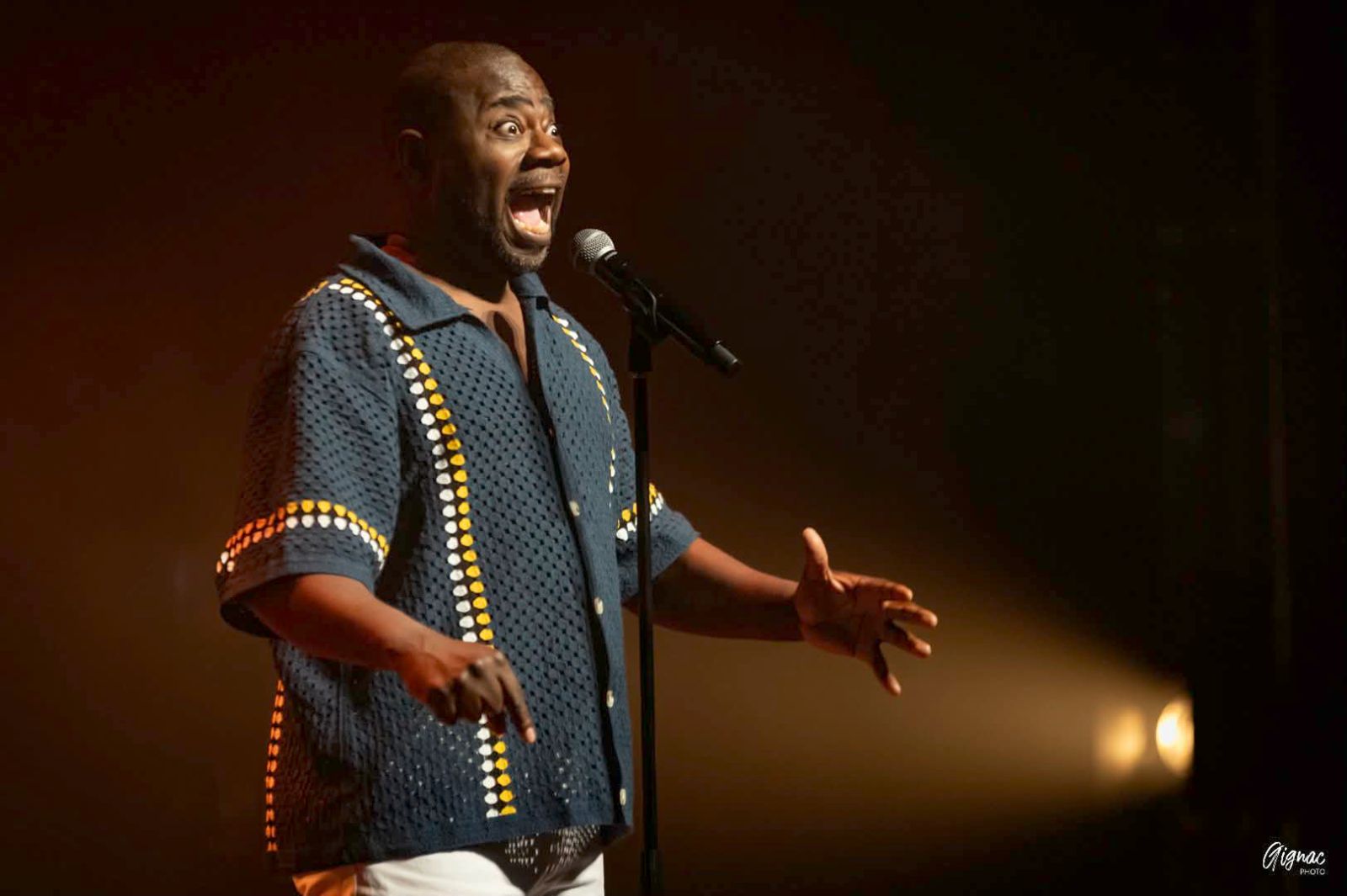 L’humoriste d’origine haïtienne transforme la scène en fête culturelle. Il a le sens du punch dans tous les sens du terme. Un punch bien dosé, juste assez relevé. Un punch coloré et savoureux aux douces essences multiculturelles.