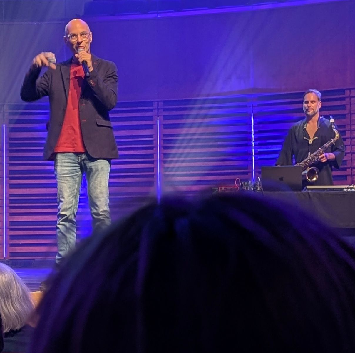 Tout au long de la soirée, Werber était accompagné d’un saxophoniste qui installait une ambiance musicale douce et enveloppante. Sur scène, il se promenait tranquillement, en pied de bas, d’un côté à l’autre, donnant le ton d’une rencontre intime. Avec sa voix posée et apaisante, il amenait naturellement le public à faire ce qu’il proposait : chanter, respirer, méditer, se laisser guider.
