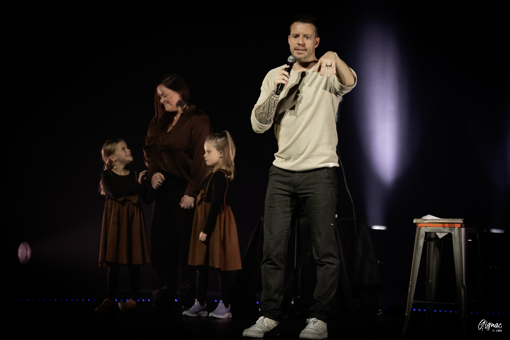 À la fin du spectacle, au moment de faire ses remerciements, dans un moment touchant, il a fait monter sa blonde et ses jumelles sur scène avant de prendre une photo de lui afin d’immortaliser la foule venue en ce soir de première.